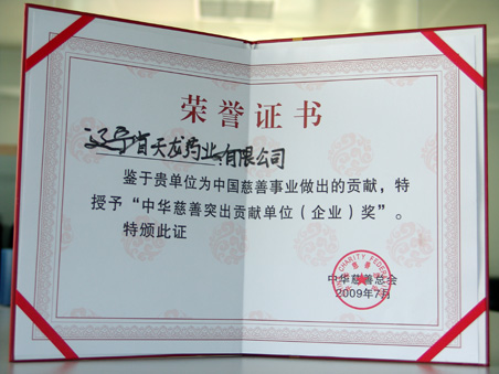經(jīng)過為期3個多月的所屬會員單位組織、申報、材料整理、初選、媒體公示、復(fù)評、終審等環(huán)節(jié),經(jīng)中華慈善總會會長辦公會議討論通過,決定授予215個單位(企業(yè))其中,遼寧天龍藥業(yè)有限公司“中華慈善突出貢獻(xiàn)單位(企業(yè))獎”。